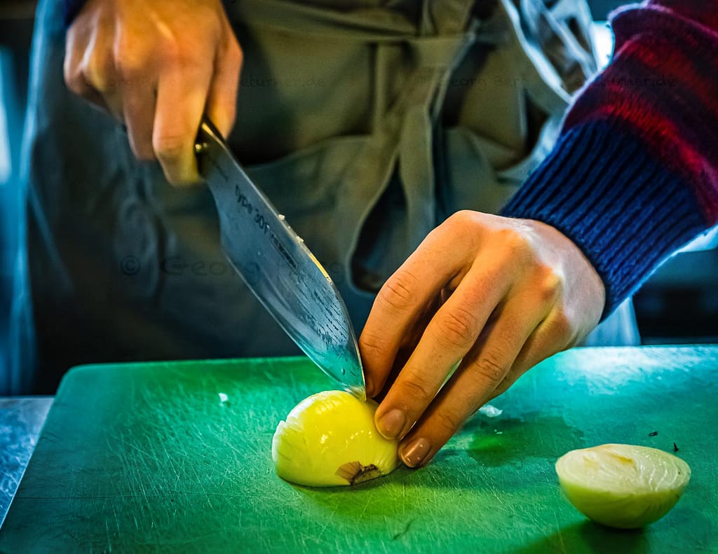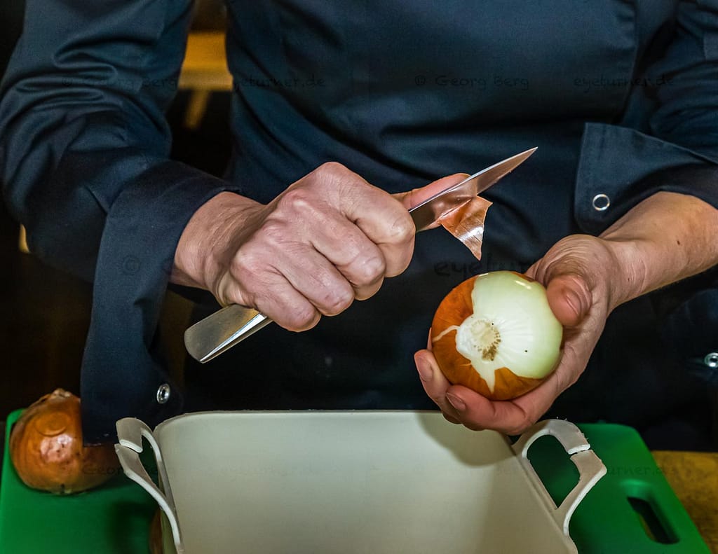 Couper un oignon avec László Papdi. Que la coupe d’un oignon soit larmoyante ou non dépend en grande partie de la technique de coupe et du tranchant d’un couteau / © Photo : Georg Berg