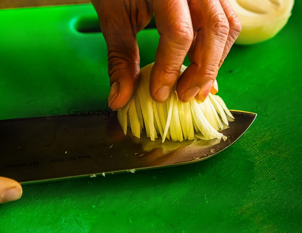 Ensuite, on pratique une ou deux coupes horizontales selon la taille de l’oignon. La troisième coupe est parallèle à la racine et permet de découper de beaux petits cubes d’oignons. László est convaincu que la coupe de l’oignon sans larmes est aussi une question d’entraînement. Après avoir coupé plusieurs milliers d’oignons au cours de sa carrière, le gaz irritant n’a plus beaucoup d’effet sur lui.