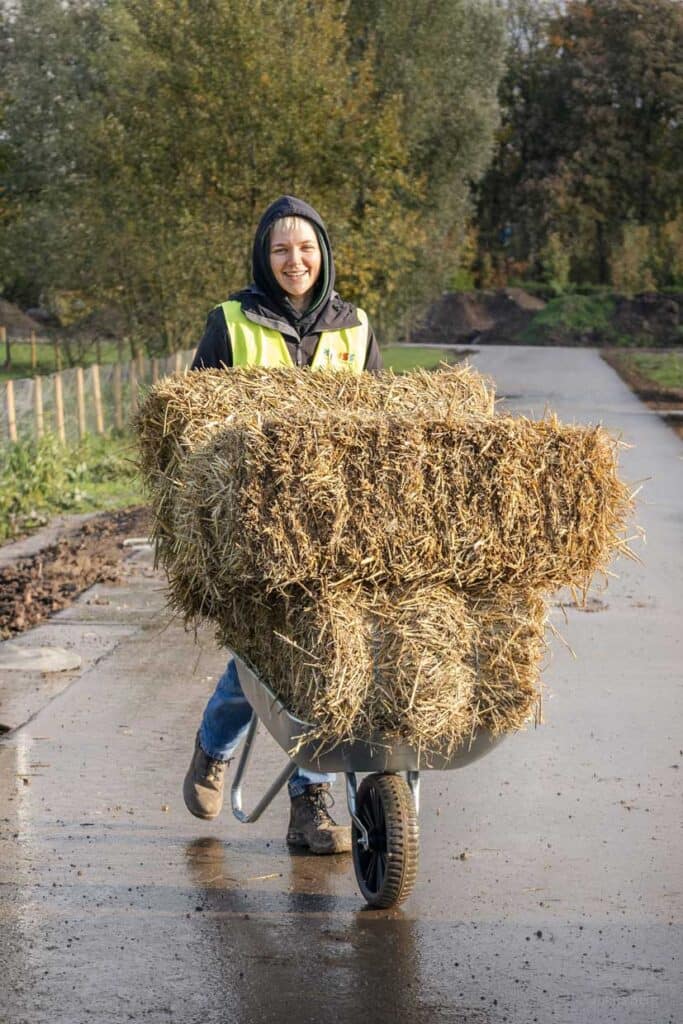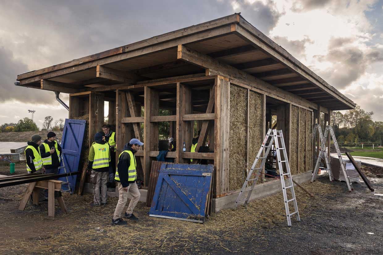 “Pour les ateliers d’août et d’octobre 2025, nous avons recruté des participants via les médias sociaux : Un tiers étaient des étudiants, deux tiers des débutants – dont un constructeur d’argile qualifié et un grimpeur industriel”, rapporte Franziska Müller. Pour la construction du pavillon de skate, deux ateliers ont été organisés : l’un pour la construction, l’autre pour l’utilisation de la paille et de l’argile. Müller souligne que le fait de “construire soi-même et de participer” convient parfaitement à la construction écologique. Elle montre que l’architecture durable est un processus collectif qui intègre également ce qui n’est pas planifié. Elle cite l’exemple de vieilles portes de boxes d’écuries qui, après avoir été remaniées, étaient soudain trop larges de deux centimètres. De telles situations nécessitent de l’improvisation et aiguisent le regard sur l’utilisation de la substance existante.