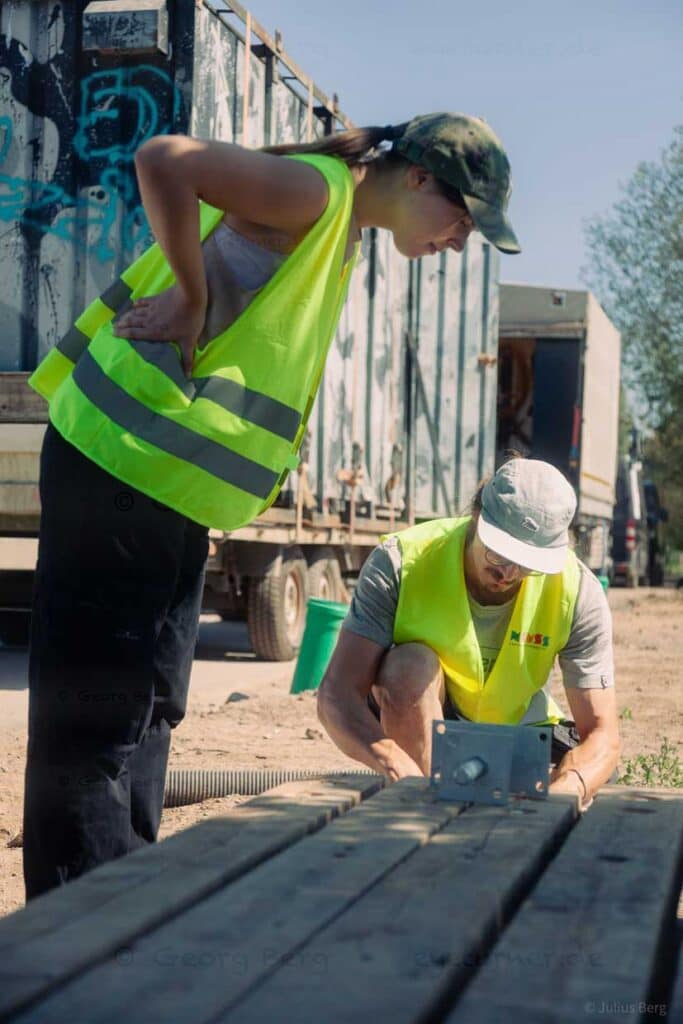 Tous auraient pu s’entraider et partager leurs connaissances, ce qui aurait fait du chantier un véritable lieu d’apprentissage et de rencontre. Pour chaque atelier, ils ont passé quatre jours et trois nuits à la Haus der Jugend de Neuss, où ils ont vécu et travaillé. C’est ainsi qu’est né un lien social durable – un réseau fait de pure initiative personnelle et d’intérêt, sans crédits universitaires ni pression des notes, s’enthousiasme l’architecte.